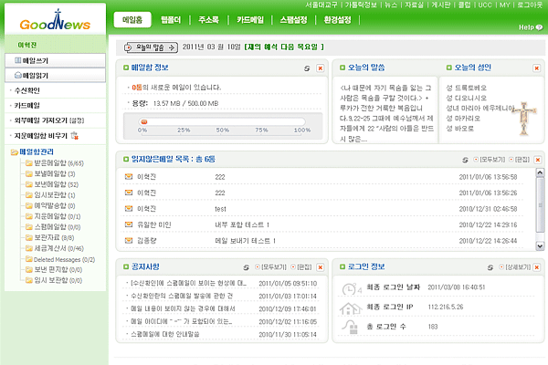 메일홈은 기본적으로 제공하는 메일함 및 개인이 생성한 메일함, 읽지 않은 메일, 플래그 메일, 수신확인, 메일이력의 주요 기능들을 한 눈에 파악할 수 있도록 해줍니다.