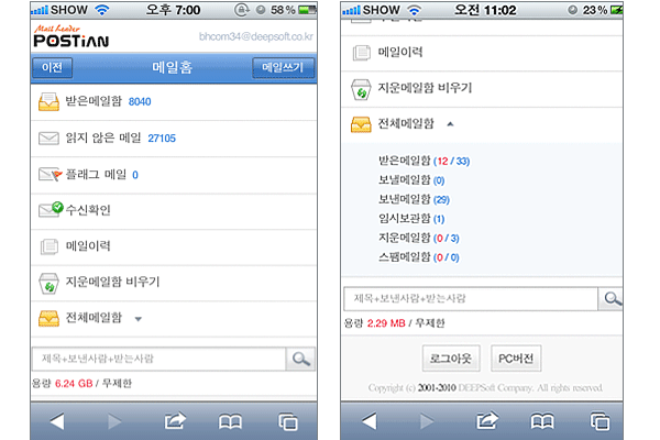 또한 PC 버전에서 작성된 주소록과 편지함 목록을 사용하여 편리하게 메일을 사용할 수 있습니다.